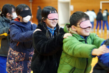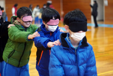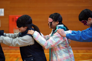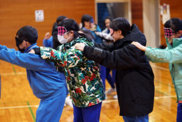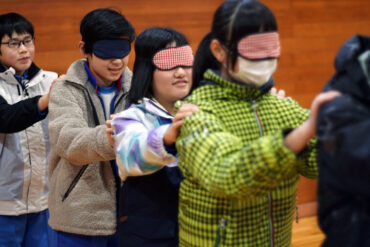 目隠しをして一列で歩きます。リーダーは列の一番後ろからしゃべらずに案内します。