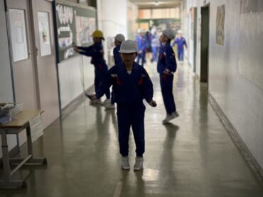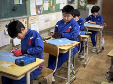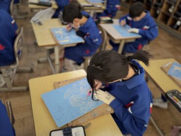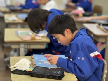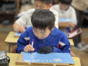 図工の版画の板を一生懸命に、静かに彫刻刀で彫っているところです。刃物で板を削るので少し危険を伴います。慎重に、一心不乱に手を動かしていました。