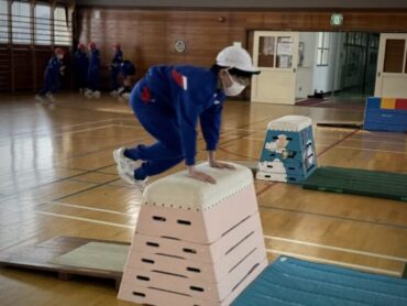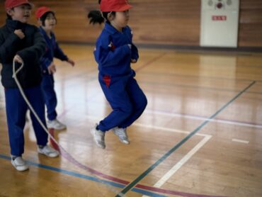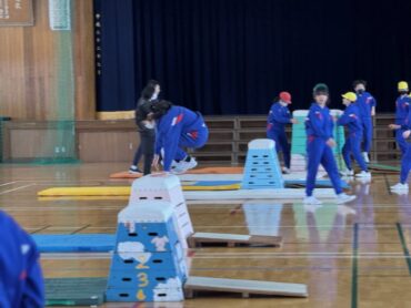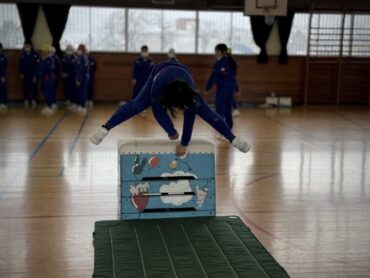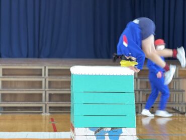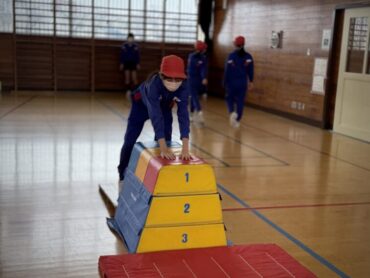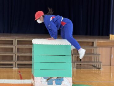 体育の授業で前半は大なわとび、後半は跳び箱をしました。自分が挑戦したい場所で練習を重ねました。