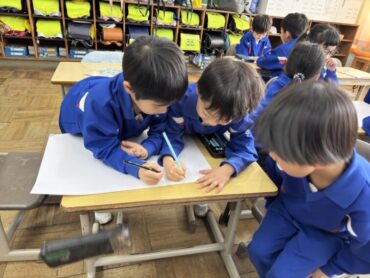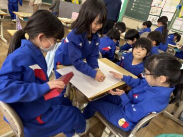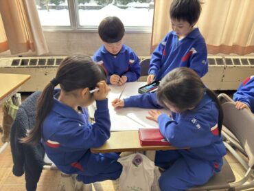 生活科で2月4日(水)に伏木古府保育園、第二幼稚園の年長児さんと行う「なかよし交流会」の練習や準備をしました。各自の担当を決め、準備開始です。教科書を参考にしながら、説明を書きました。