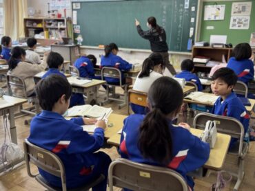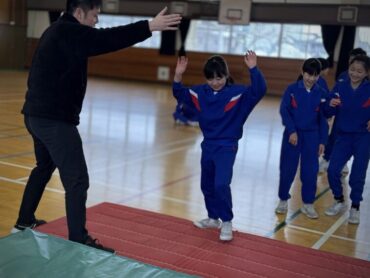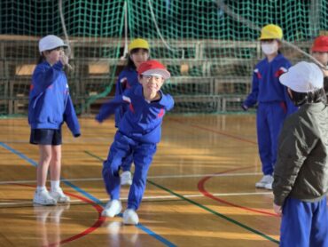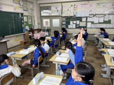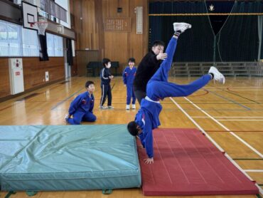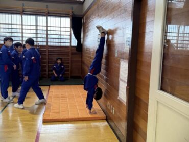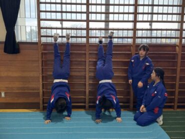 体育のマット運動です。体育館に入ると、きれいなかべ倒立の姿が目に入りました。肋木で少しずつ足を高く上げていく練習をしている児童もいました。倒立の体勢に慣れていくといいですね。かべ倒立ができたら、倒立前転へ。先生や友達に補助してもらいながら、チャレンジしていました。