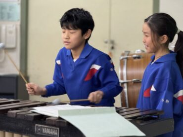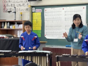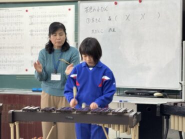 音楽の授業で「茶色の小びん」の演奏の役割分担を決めていました。大太鼓が人気のようで、大勢の希望者がいましたが、じゃんけんで決定。早々に決まった木琴の希望者は、練習に励んでいました。