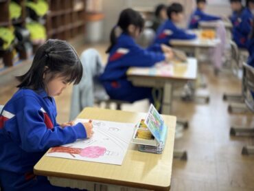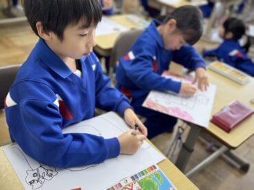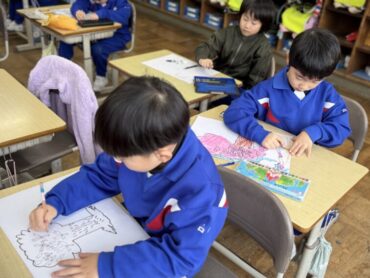 卒業式や入学式のときに廊下等に掲示するお祝いのポスターを描いていました。大きく線描きして、丁寧に色を塗りました。桜や校舎、ランドセル等が多かったです。