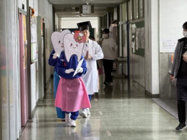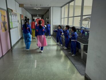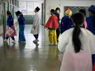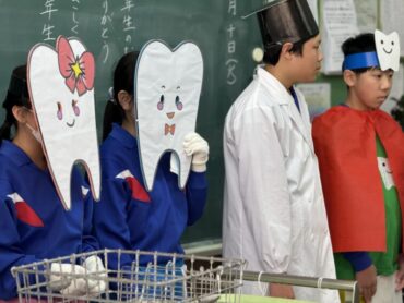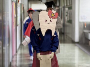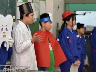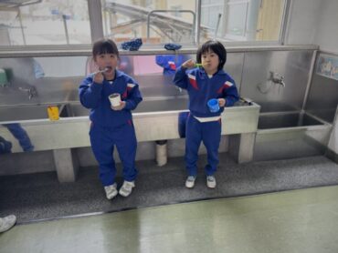 今日の仕事を終えて帰っていくはっぴい隊。1年生にも大人気になりました。かみかみだけでなく、はみがきもしっかりとしていますね。