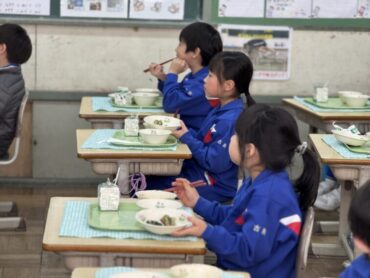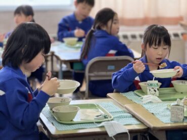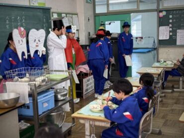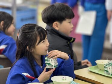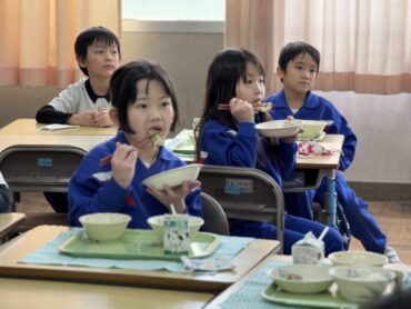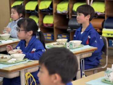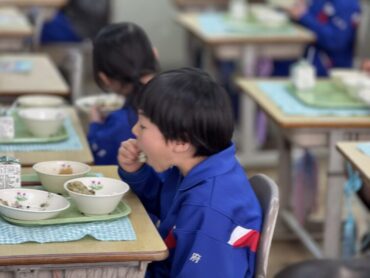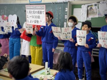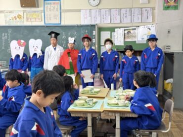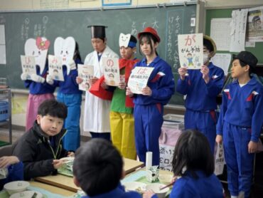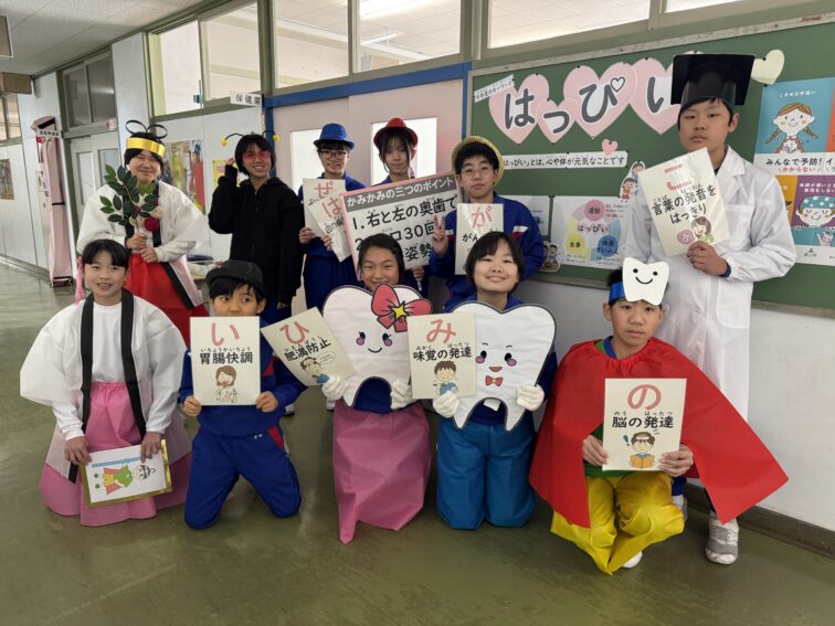 2年生は食べるのが早く、もうすっかり片付けも終わっている児童もいました。でも、食べている子と一緒に、口を動かして、30回のかみかみ体験を行いました。かむことにはいいことがいっぱいです。