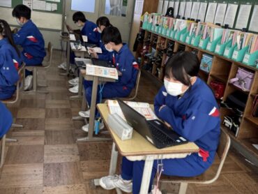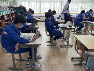 家庭科の学習で、調理計画を立てているところです。今日大事なことは、効率よく調理を進める手順を考えることです。学習専用端末で、作業を書いたバーを移動させながら、「湯を沸かしながら、その間に野菜を切って……」など、スムーズに調理できるように考えました。