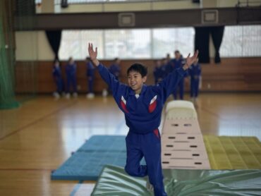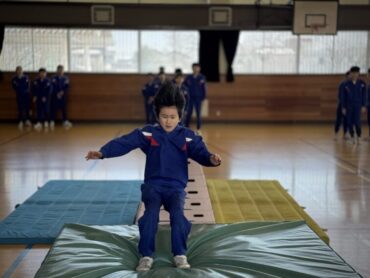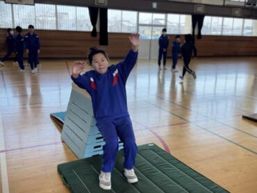 体育ではこの前までマット運動をしていましたが、跳び箱運動になりました。台上前転では、ちょっとこわいなと踏み切れない5年生もいました。一方で、写真のようにどんどんチャレンジする児童もいて、着地もきれいに決まっていました。