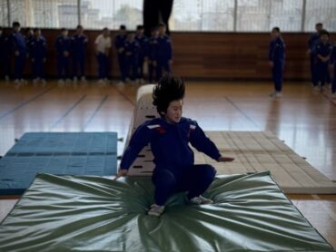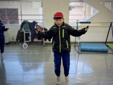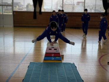 教室へ行ったら、ある児童が「体育の時間に来てください」というので、体育の授業を見に行きました。開脚跳びの後、台上前転の練習が始まりました。自分が挑戦したい練習の場に行って、チャレンジしました。