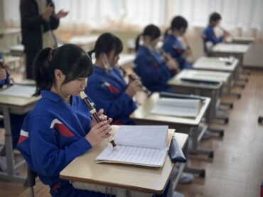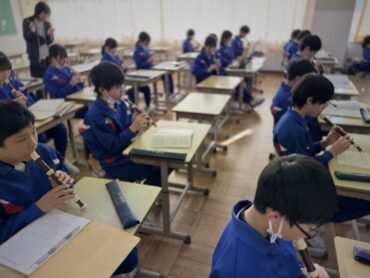 6年生・・・音楽室で「Paradise Has No Border」の合奏練習