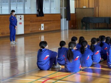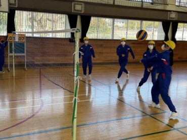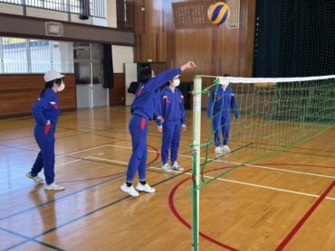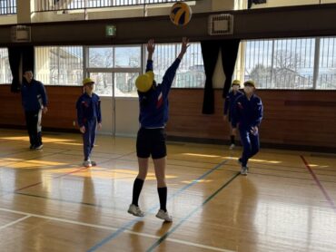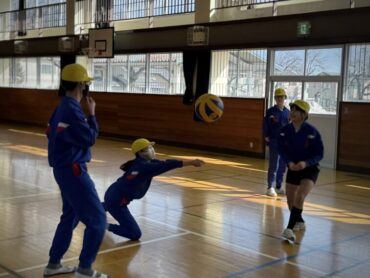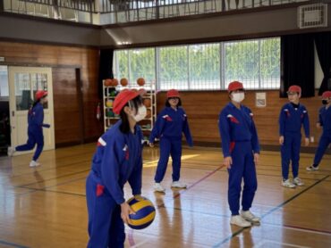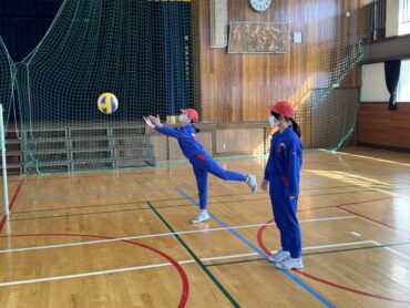 体育の授業で、ソフトバレーボールが始まりました。チームで協力して、ボールを拾いました。失敗しても、生き生きとプレーする姿が見られました。