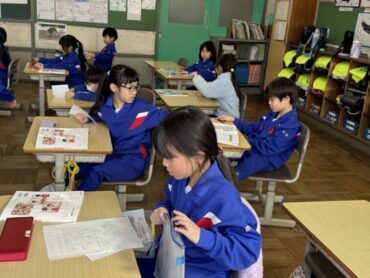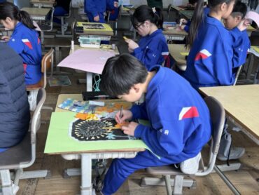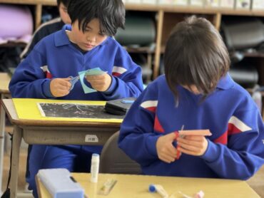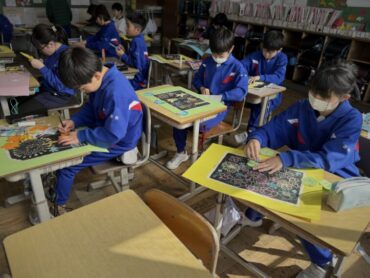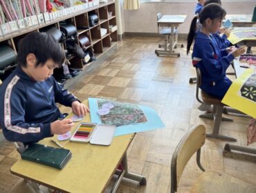 図工の版画に着色し、卒業や入学のお祝いの言葉を貼りました。白と黒の版画に色が付くと、雰囲気がガラリと変わりますね。4年生はとても丁寧に作業を進めていました。