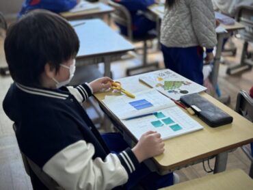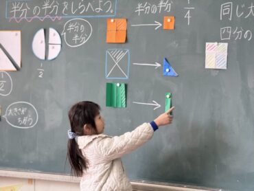 算数「半分の半分をしらべよう」です。分数の勉強が始まりました。色紙をいろいろな形に切って、気付いたことをノートに書いたり、発表したりしました。