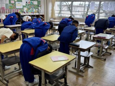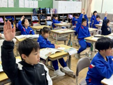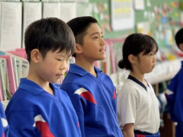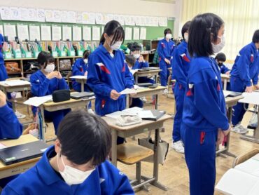 卒業を祝う会の練習を教室でしているところです。4年生は、6年生へ感謝の気持ちを伝え、プレゼントを渡すことになっています。大きな声で力強く言葉を言っていました。いい姿勢で立ち、礼もしっかりとできていて、とてもよい態度でした。