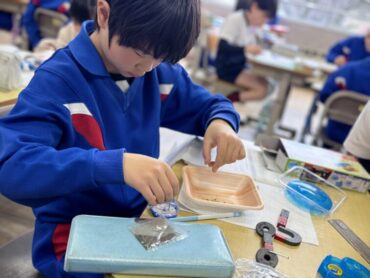 真剣な様子で磁石の実験をしていました。磁石に近付けた釘が磁石になっていることを確かめました。釘を方位磁針の針に近付けて、動くかどうか試してみていました。真剣に針を見つめる様子が素敵ですね。