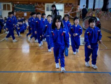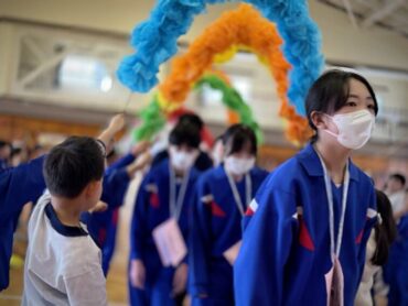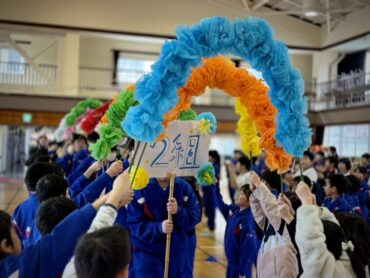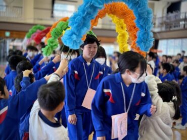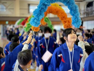 6年1組の入場です。アーチを作っているのは2年生。