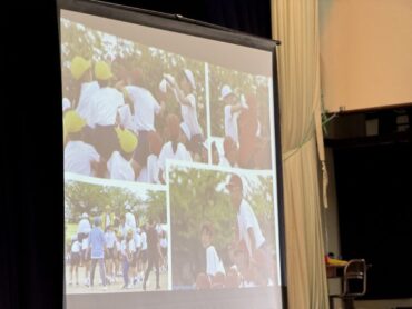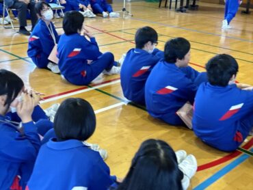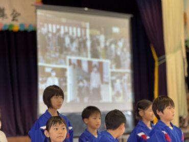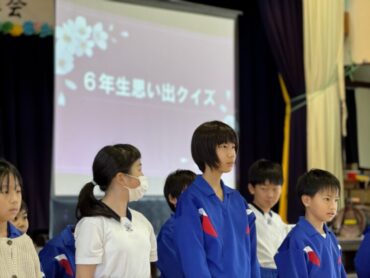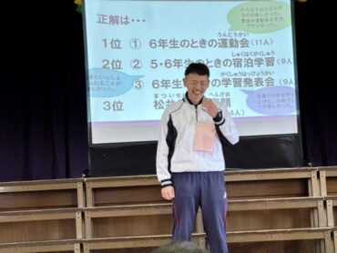 6年生にアンケートをとって調べた内容をクイズにして出題しました。6年生は学校生活のことを振り返って思い浮かべていました。在校生も一緒に考え、楽しみました。