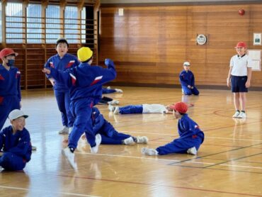 体育の授業で、「だるまさんがころんだ」をしていました。走ったり、止まったり、いい運動になっていたようです。この後、「だるまさんが○○した」で、さらに体を動かしました。