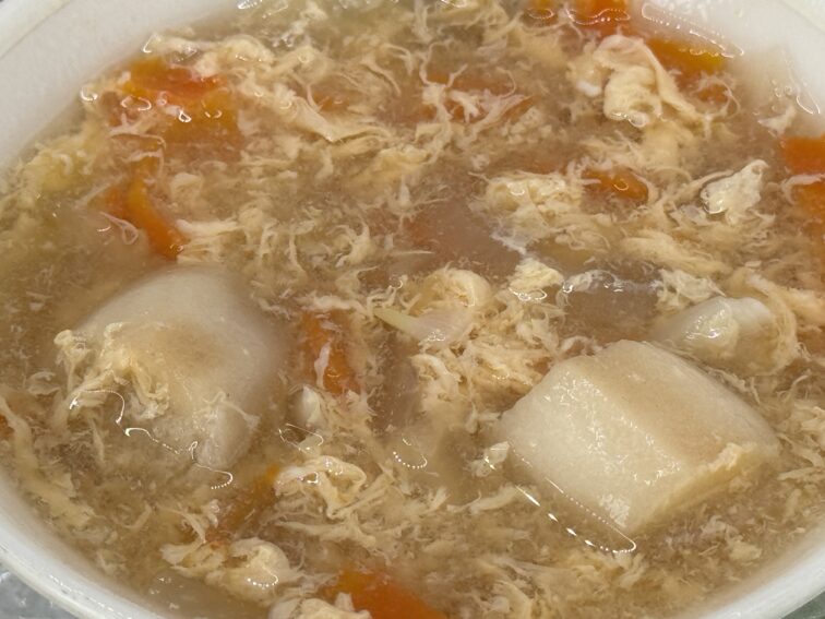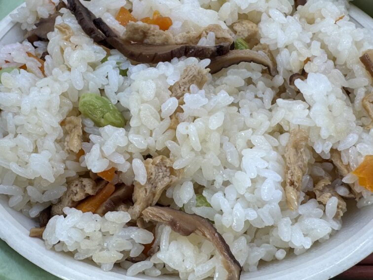 今日の春色ちらし寿司には、枝豆が入っています。「まめ」という言葉には「健康でまめに働くことができるように」という意味があります。また、「生きている間、食べ物に困らないように」という願いを込めて、人参やたけのこ等、たくさんの食材を使った華やかなちらし寿司に仕上げました。