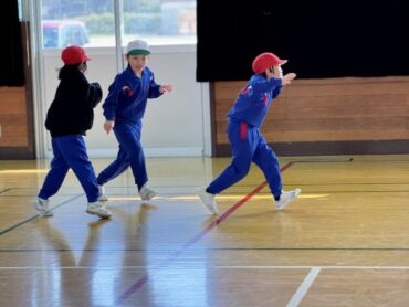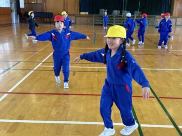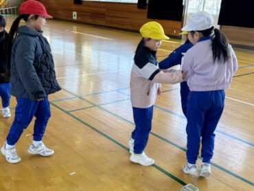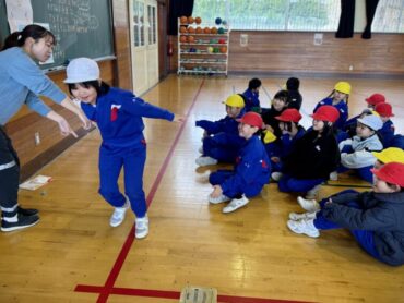 体育「体ぜんたいをつかって虫になりきろう」で、ハチになりきりました。一人の児童がお手本になって、ハチのポイントを確認しました。その後、体育館を飛び回りました。時には、チクッと刺すことも。