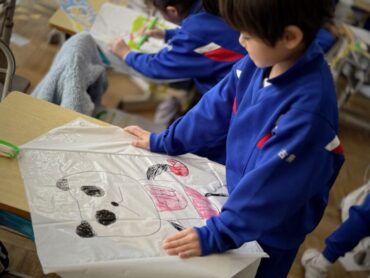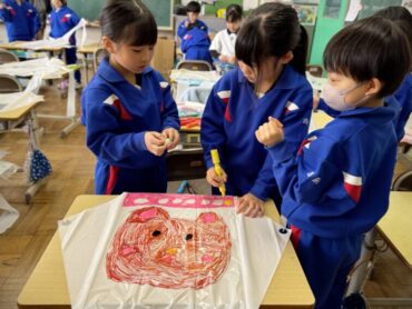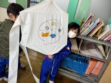 先日作っていたたこが完成に近付いていました。マジックで大きくイラストを描いて、色を塗っています。たこが高く上がっても自分のものがよく分かりそうです。
