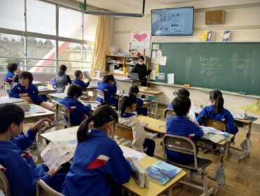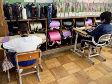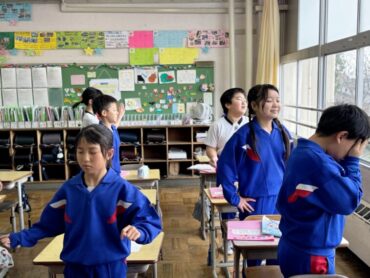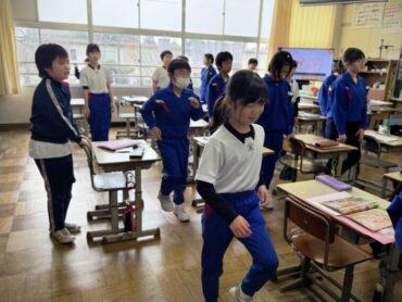 外国語活動の時間には、道案内の勉強をしました。英語の先生の指示に従って、自分の席で歩いたり、方向を変えたりします。目を閉じて、”Go straight.” “Turn right.”・・・とみんな一斉に行動するのですが、聞き逃したり、右と左を間違えたりして、目を開けたときには、向いている方向がばらばらになっていることもありました。全員揃うのは難しかったです。