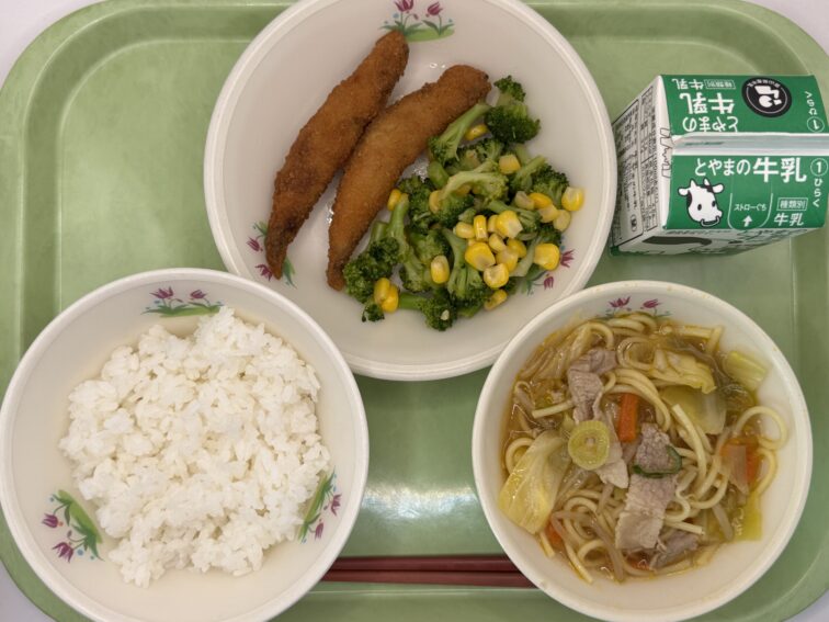 2026.3.10 NEW 全校生 3/10(火)の給食 3/10(火)の給食です。 減量ごはん 牛乳 ししゃものフライ 五目ラーメン 今日は五目ラーメンについてのお話です。 五目ラーメンとは5種類の具材が入っていることではなく、「たくさんの」という意味で、様々な材料を味や彩り、栄養を考えて取り合わせたものを指しています。今日のラーメンには、豚肉、人参、玉ねぎ、きゃべつ、ねぎ、が入っており、具だくさんで食べ応えがあります。よくかんで食べましょう! ブロッコリーサラダ