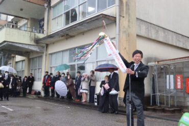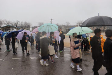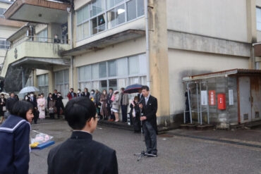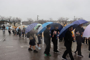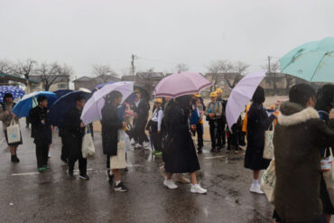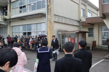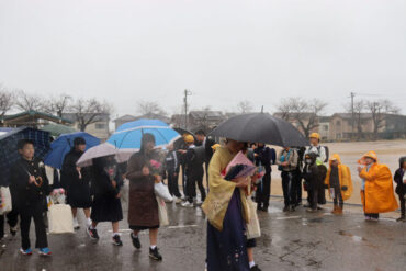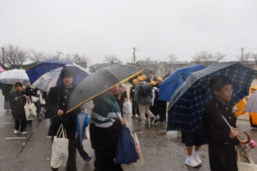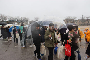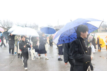 卒業生へ、ご健勝、ご多幸、ご活躍を祈ってお返しの万歳をしました。雨が強くなり、かさや荷物で盛大な万歳ができなかったのが心残りです。