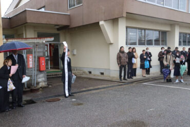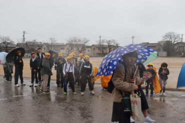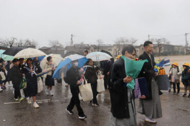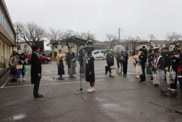 外に出て、門出の式を行いました。気温が低く、次第に雨が激しくなり、悪天候の中での門出となりました。