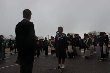 校長先生の話。正岡子規の「春風や 闘志抱きて 丘に立つ」という俳句を紹介され、古府っ子を激励されました。春風には程遠い日になってしまいました……。