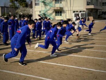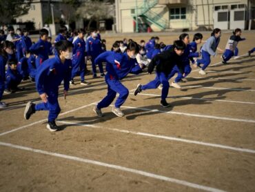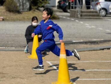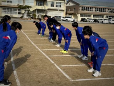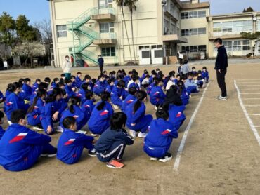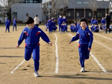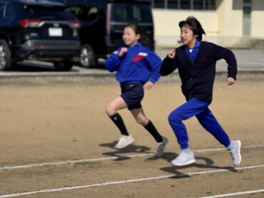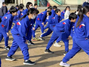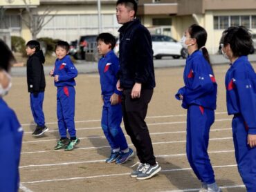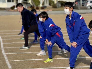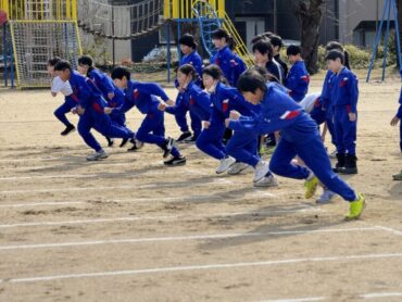 朝5運動を再開しました。今日は全校児童で、短距離走のスタートの練習をしました。運動委員会が前に出て準備体操を進めました。
