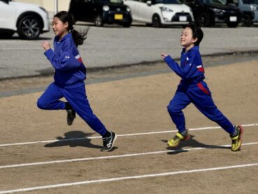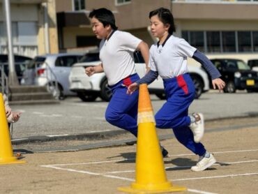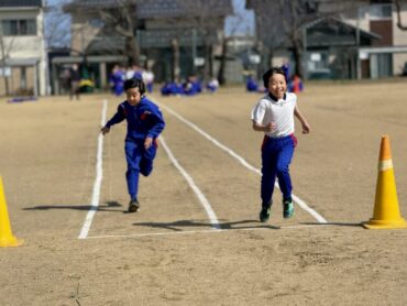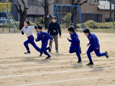 合同で体育の授業をしました。グラウンドで50m走のタイム測定です。ウォーミングアップで軽くスタートダッシュをしてから、測定に入りました。ゴールまで全力で頑張りました。