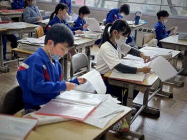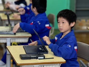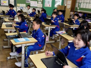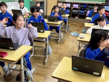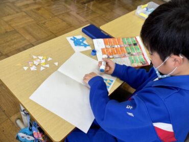 算数の図形の模様作り→ドリルの仕上げ→キーボード練習をしていました。模様作りでは、三角形を貼り合わせてカラフルで面白い図形ができました。細かい作業ですが、力作がネームプレートと共に黒板に貼られていました。