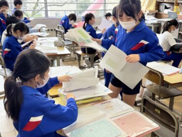 次の時間。3年生で書いたたくさんのいろいろな作文やチェックカード類が返され、ファイルに綴っていました。入れながら、1年間を振り返っていました。