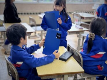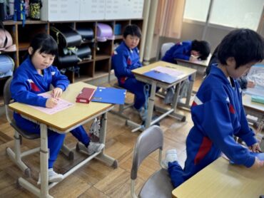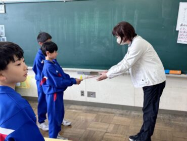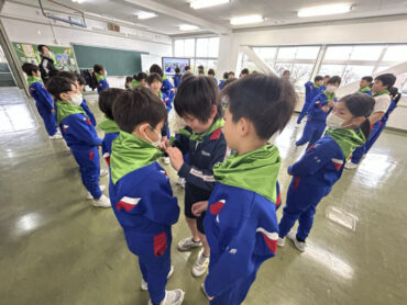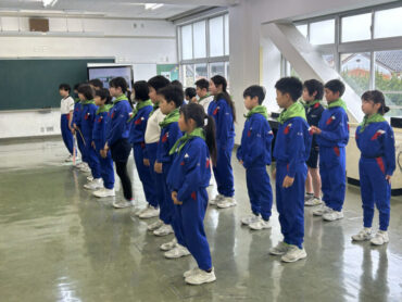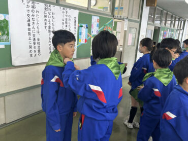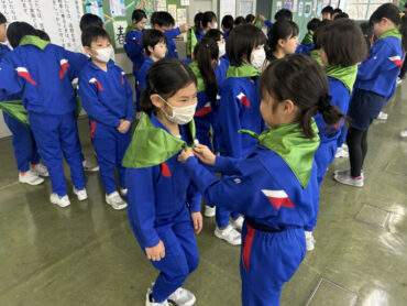 朝5運動はありませんでしたが、朝の時間を使って4年生から3年生へと交通少年団の引継ぎ式を行いました。交通少年団員の証である緑のスカーフを巻いてあげました。4年生は立派な態度で優しく接し、3年生も嬉しそうな表情でした。スカーフだけでなく、4年生の思いも受け継いで交通安全を呼びかけていってほしいと思います。