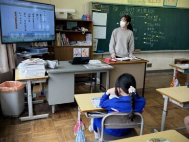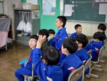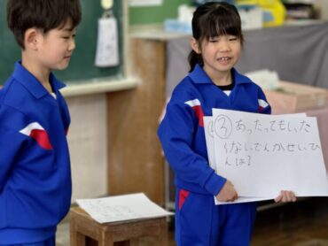 5年生も今日はお楽しみ会です。教室で「あたまおしりゲーム」が始まるところでした。各チームの代表者を選んで、ゲームに挑戦しました。頭とお尻の平仮名の間に、できるだけ多くの文字が入ると特典も多くなります。代表の児童は素早く頭を働かせて、なかなかいい答えを発表していました。