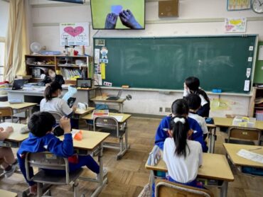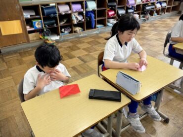 お楽しみ会の続きです。みんなで動画を見ながら折り紙を折っていました。少し難しい折り紙だったようですが、できた児童が手伝いました。