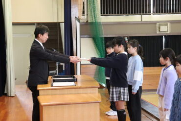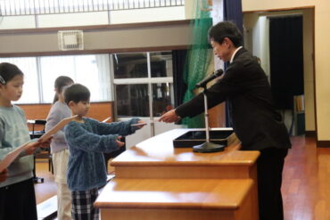 校長先生から、各学級の代表児童に修了証が渡されました。