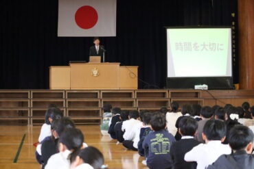続いて終業式が行われ、校長先生のお話を聞きました。各学年が成長したことを紹介した後、「10000時間の法則」について話をされました。時間を大切にし、努力を続けることの大切さを伝えられました。